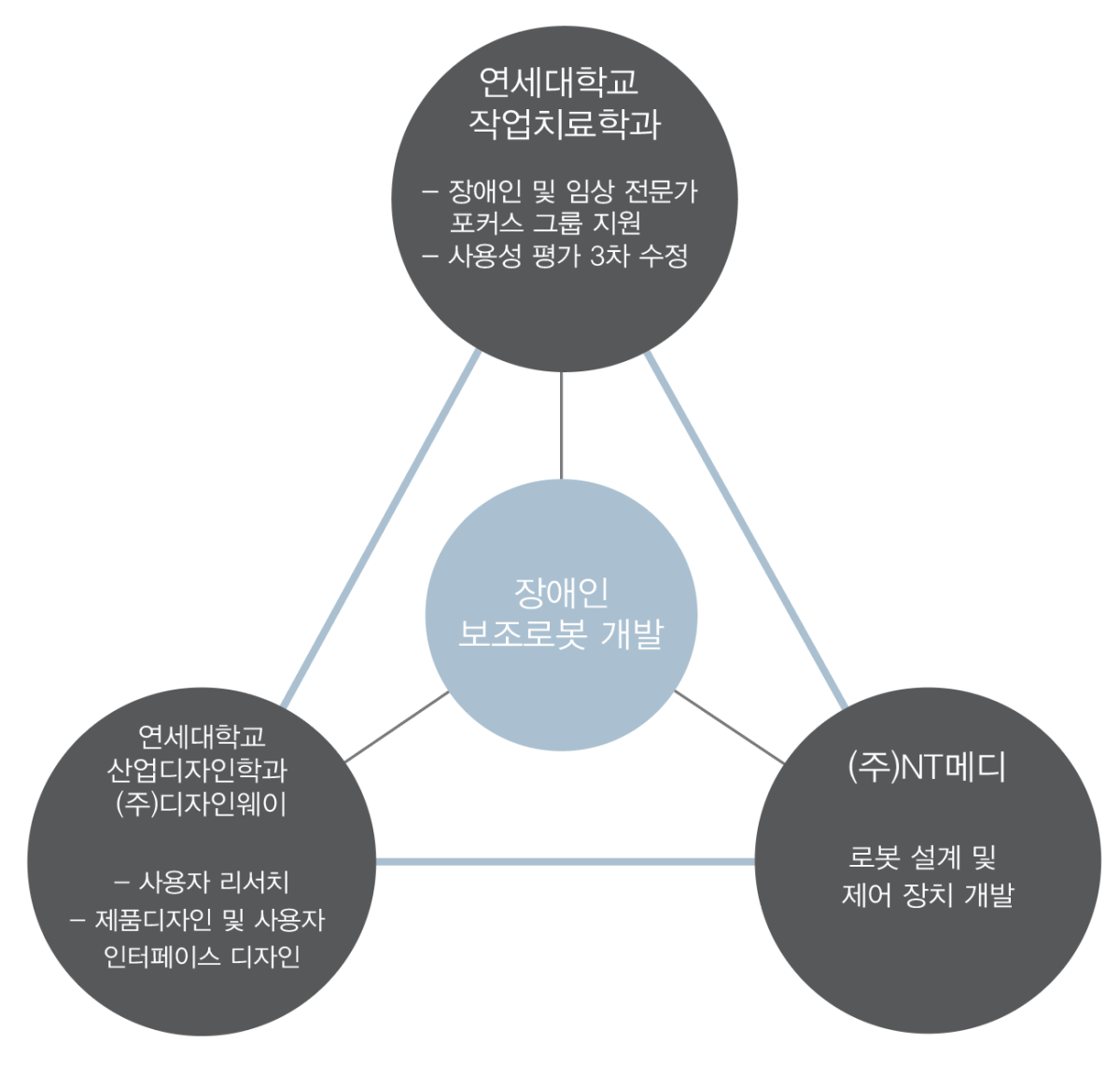현재 디자인 전공 연구원으로 참여하고 있는 장애인 보조로봇 개발 과제는 3개의 팀으로 구성되어 있다. 첫 번째 팀인 연세대학교 작업치료학과에서 장애인 및 임상 전문가 포커스 그룹 지원 및 3차에 걸친 사용성 평가를 수행한다. 두 번째 팀인 연세대학교 산업디자인학과에서 사용자 리서치를 진행하고 그 결과를 제품에 반영하며, 디자인 전문회사인 (주)디자인웨이에서 제품 디자인을 함께 진행한다. 또한, 과제 기간 동안 4차에 걸친 디자인 전문가 자문 회의를 진행한다. 세 번째 팀은 (주)NT메디로 로봇 기술을 활용하여 로봇 설계 및 제어 장치 개발을 진행한다. 필자는 여기서 사용자 리서치와 사용자 인터페이스 연구, 즉 장애인 보조로봇 개발에서의 사용성 증진에 대한 연구를 진행하고 사용자 인터페이스에 이를 반영하는 역할을 하였다. 필자는 평소에 디자인 전공자의 역량과 역할에 대한 관심이 많기 때문에 본 개발에 참여하면서 느낀 디자인 전공자의 역할에 대한 이야기를 하고자 한다.